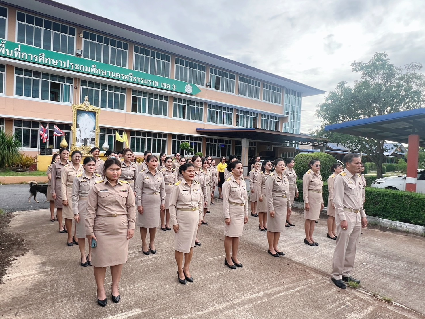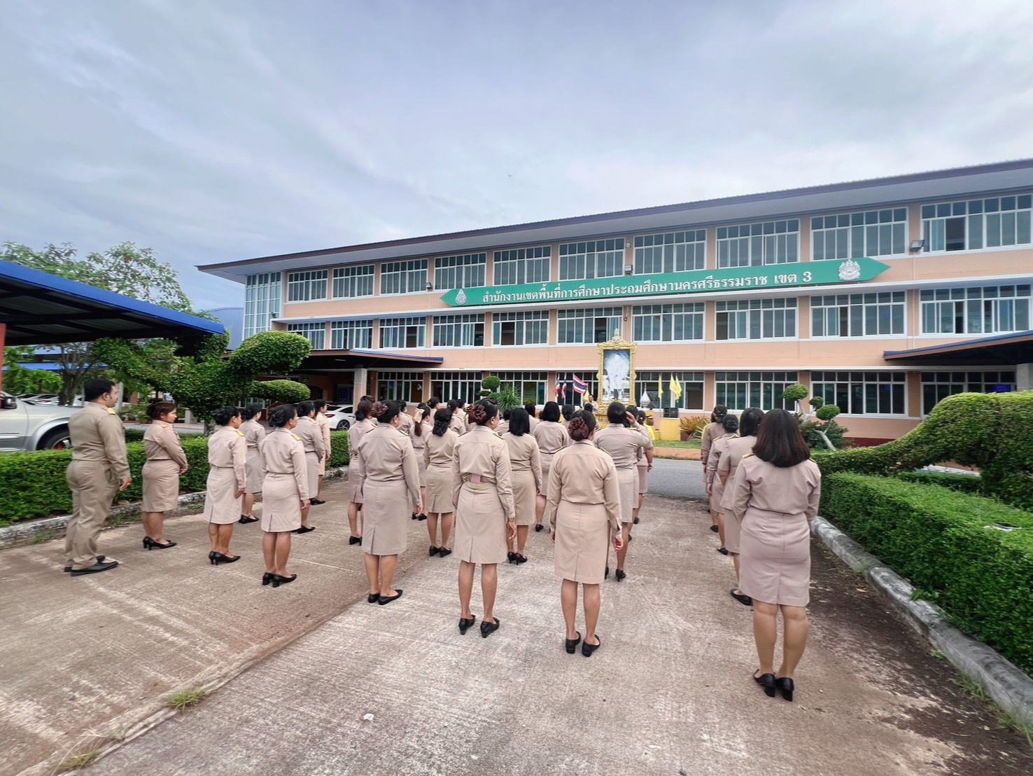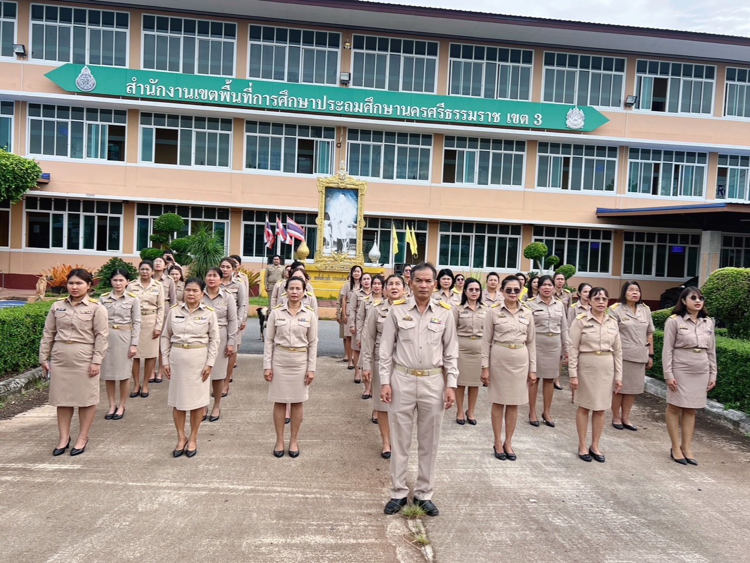 วันจันทร์ที่ 29 กันยายน 2568 นายพิพัฒน์ แสนโสม ผู้อำนวยการสำนักงานเขตพื้นที่การศึกษาประถมศึกษานครศรีธรรมราช เขต 3 มอบหมายให้ นายโสภาส โอพริก รองผู้อำนวยการสำนักงานเขตพื้นที่การศึกษาประถมศึกษานครศรีธรรมราช เขต 3 พร้อม บุคลากร สพป.นศ.3 เข้าแถวเคารพธงชาติและร้องเพลงชาติไทย เนื่องในวันพระราชทานธงชาติไทย เพื่อรำลึกในพระมหากรุณาธิคุณของพระบาทสมเด็จพระมงกุฎเกล้าเจ้าอยู่หัว (รัชกาลที่ 6) ผู้พระราชทานธงไตรรงค์เป็นธงชาติไทยเมื่อปี พุทธศักราช 2460 อันเป็นสัญลักษณ์แห่งความเป็นชาติไทยที่ใช้สืบต่อมาจนถึงปัจจุบัน โดยคณะรัฐมนตรีได้มีมติกำหนดให้วันที่ 28 กันยายนของทุกปีเป็น “วันพระราชทานธงชาติไทย” ตั้งแต่ปี พ.ศ. 2560 เป็นต้นมา ณ สำนักงานเขตพื้นที่การศึกษาประถมศึกษานครศรีธรรมราช เขต 3