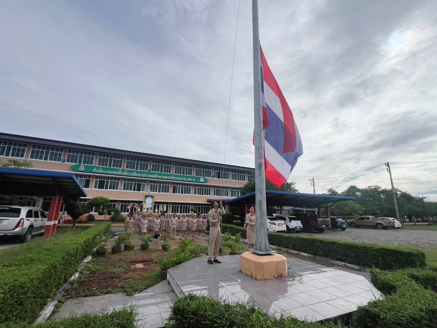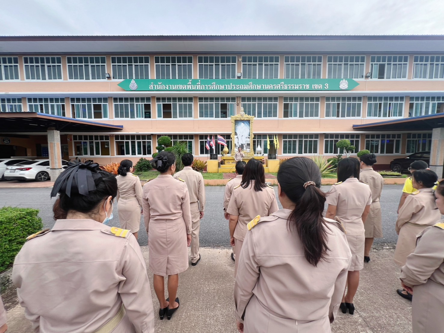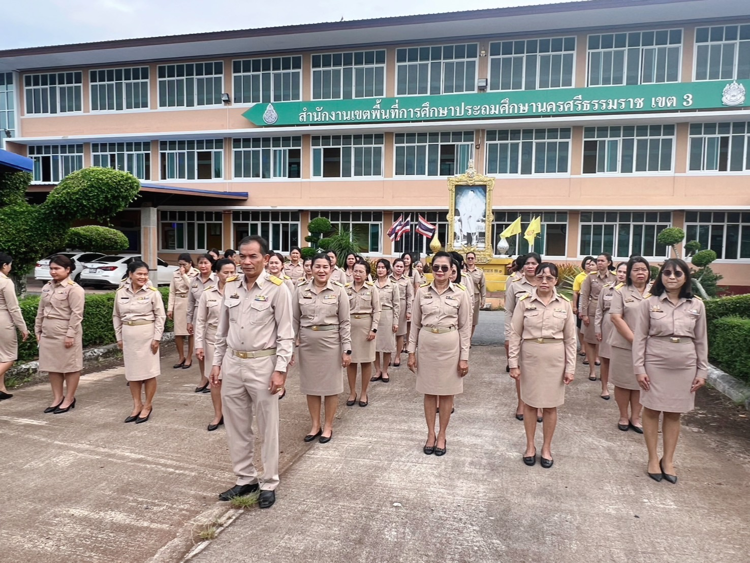 วันจันทร์ที่ 29 กันยายน 2568 นายพิพัฒน์ แสนโสม ผู้อำนวยการสำนักงานเขตพื้นที่การศึกษาประถมศึกษานครศรีธรรมราช เขต 3 มอบหมายให้ นายโสภาส โอพริก รองผู้อำนวยการสำนักงานเขตพื้นที่การศึกษาประถมศึกษานครศรีธรรมราช เขต 3 พร้อม บุคลากร สพป.นศ.3 เข้าแถวเคารพธงชาติและร้องเพลงชาติไทย เนื่องในวันพระราชทานธงชาติไทย เพื่อรำลึกในพระมหากรุณาธิคุณของพระบาทสมเด็จพระมงกุฎเกล้าเจ้าอยู่หัว (รัชกาลที่ 6) ผู้พระราชทานธงไตรรงค์เป็นธงชาติไทยเมื่อปี พุทธศักราช 2460 อันเป็นสัญลักษณ์แห่งความเป็นชาติไทยที่ใช้สืบต่อมาจนถึงปัจจุบัน โดยคณะรัฐมนตรีได้มีมติกำหนดให้วันที่ 28 กันยายนของทุกปีเป็น “วันพระราชทานธงชาติไทย” ตั้งแต่ปี พ.ศ. 2560 เป็นต้นมา ณ สำนักงานเขตพื้นที่การศึกษาประถมศึกษานครศรีธรรมราช เขต 3