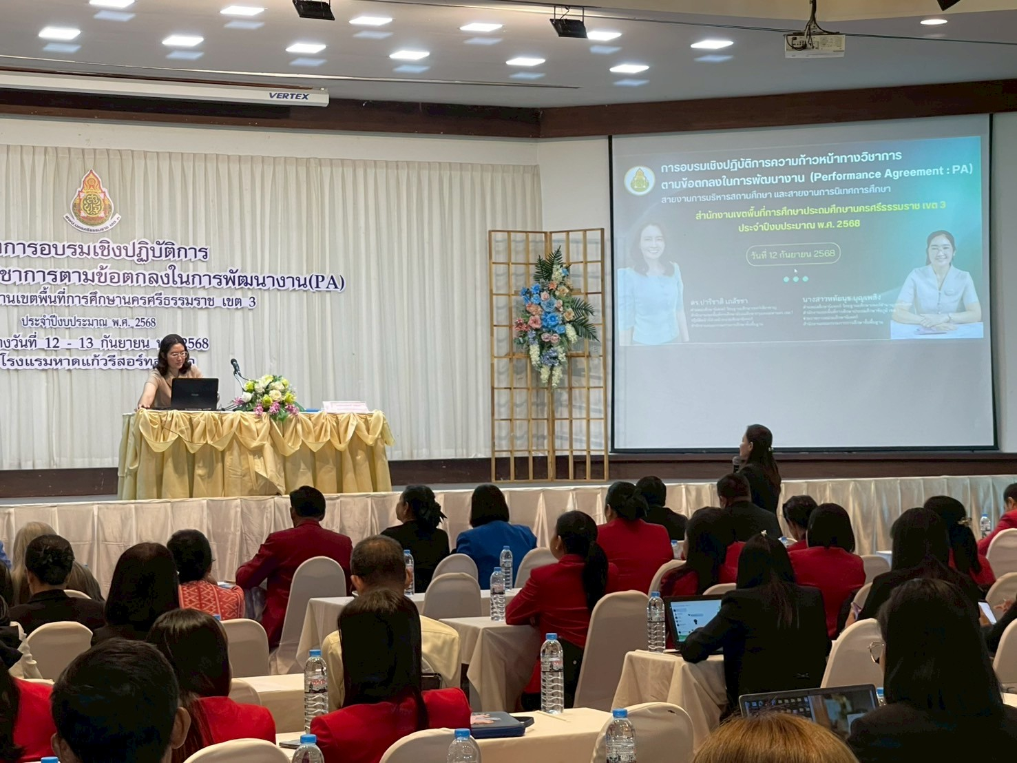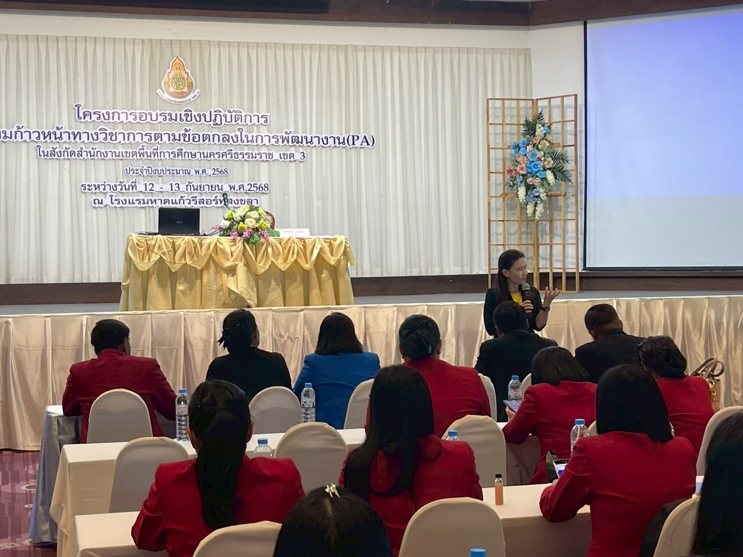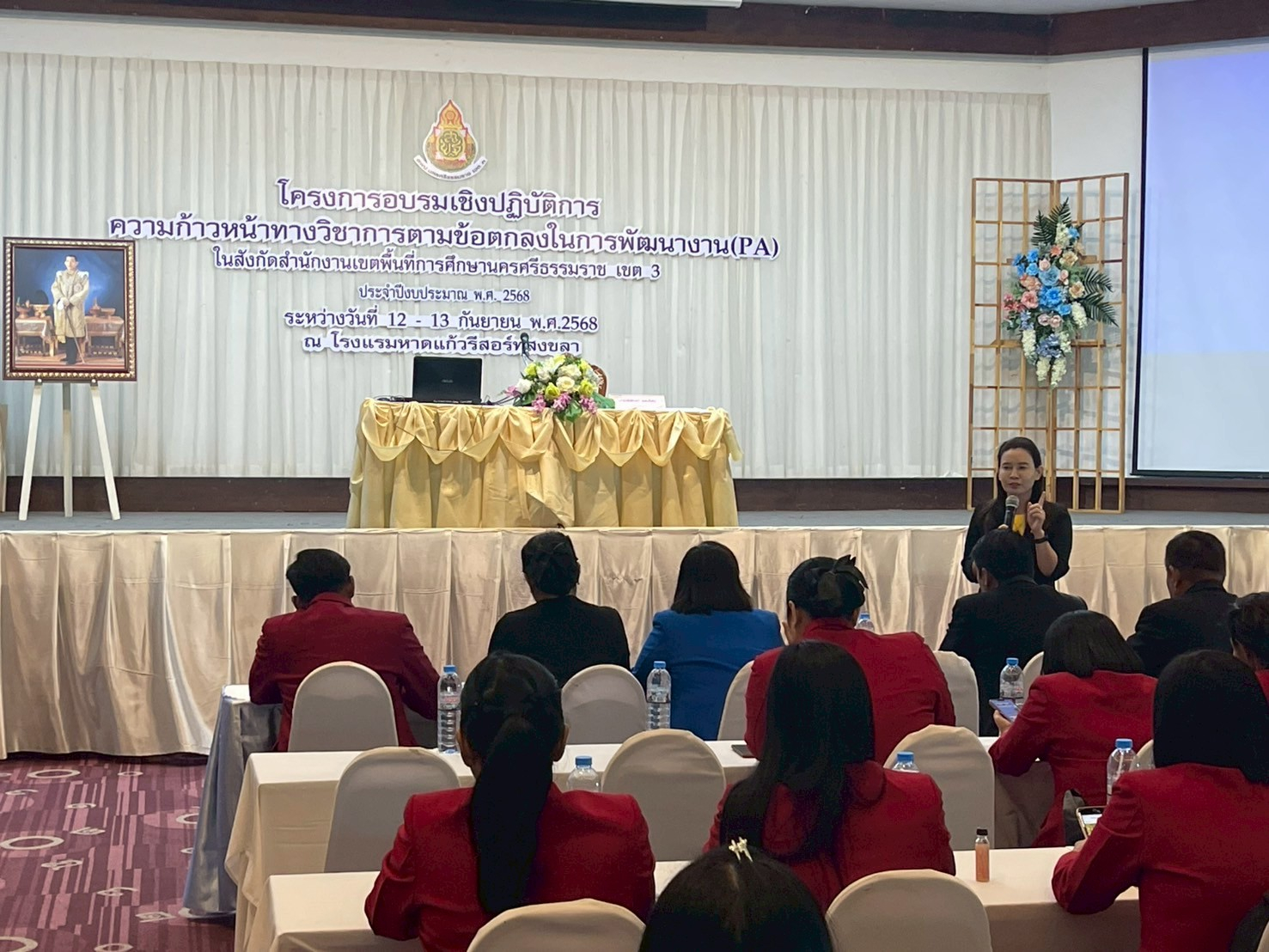 วันศุกร์ที่ 12 กันยายน 2568 นายพิพัฒน์ แสนโสม ผู้อำนวยการสำนักงานเขตพื้นที่การศึกษาประถมศึกษานครศรีธรรมราช เขต 3 เป็นประธานเปิดโครงการอบรมเชิงปฏิบัติการความก้าวหน้าทางวิชาการตามข้อตกลงในการพัฒนางาน (PA)ในสังกัดสำนักงานเขตพื้นที่การศึกษาประถมศึกษานครศรีธรรมราช เขต 3 ประจำปีงบประมาณ พ.ศ.2568 โดยจะดำเนินโครงการระหว่างวันที่ 12 – 13 กันยายน 2568 ณ โรงแรมหาดแก้วรีสอร์ท อำเภอสิงหนคร จังหวัดสงขลา