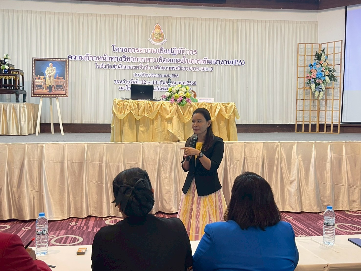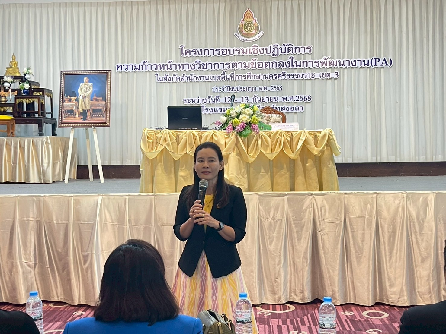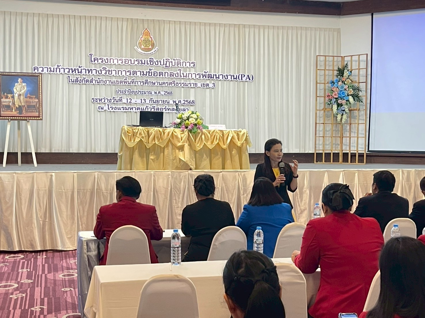 วันศุกร์ที่ 12 กันยายน 2568 นายพิพัฒน์ แสนโสม ผู้อำนวยการสำนักงานเขตพื้นที่การศึกษาประถมศึกษานครศรีธรรมราช เขต 3 เป็นประธานเปิดโครงการอบรมเชิงปฏิบัติการความก้าวหน้าทางวิชาการตามข้อตกลงในการพัฒนางาน (PA)ในสังกัดสำนักงานเขตพื้นที่การศึกษาประถมศึกษานครศรีธรรมราช เขต 3 ประจำปีงบประมาณ พ.ศ.2568 โดยจะดำเนินโครงการระหว่างวันที่ 12 – 13 กันยายน 2568 ณ โรงแรมหาดแก้วรีสอร์ท อำเภอสิงหนคร จังหวัดสงขลา
