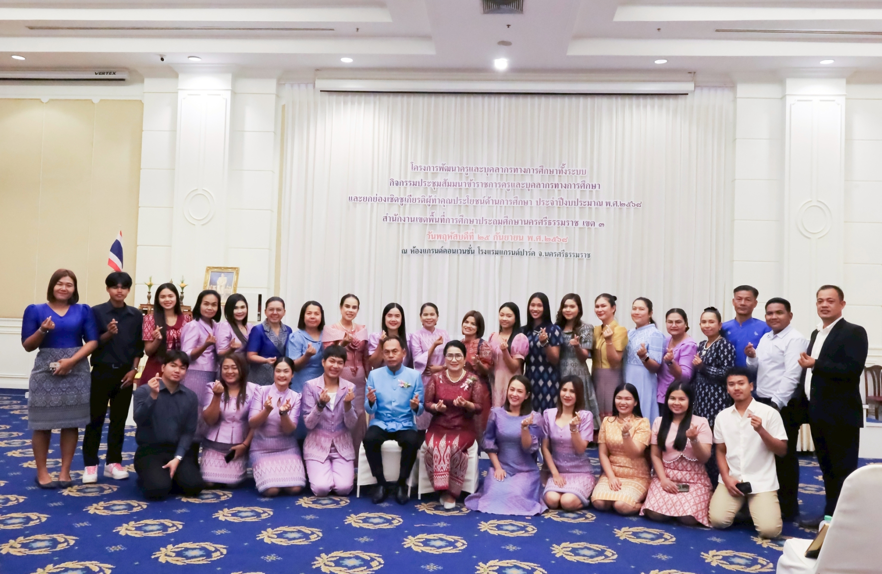 วันพฤหัสบดีที่ 25 กันยายน 2568 นายพิพัฒน์ แสนโสม ผู้อำนวยการสำนักงานเขตพื้นที่การศึกษาประถมศึกษานครศรีธรรมราช เขต 3 มอบหมายให้ นายโสภาส โอพริก รองผู้อำนวยการสำนักงานเขตพื้นที่การศึกษาประถมศึกษานครศรีธรรมราช เขต 3 ดำเนินการจัดโครงการพัฒนาครูและบุคลากรทางการศึกษาทั้งระบบกิจกรรมประชุมสัมนาข้าราชการครูและบุคลากรทางการศึกษาและยกย่องเชิดชูเกียรติผู้ทรงคุณวุฒิผู้ทำคุณประโยชน์ด้านการศึกษา ประจำปีงบประมาณ พ.ศ. 2568
