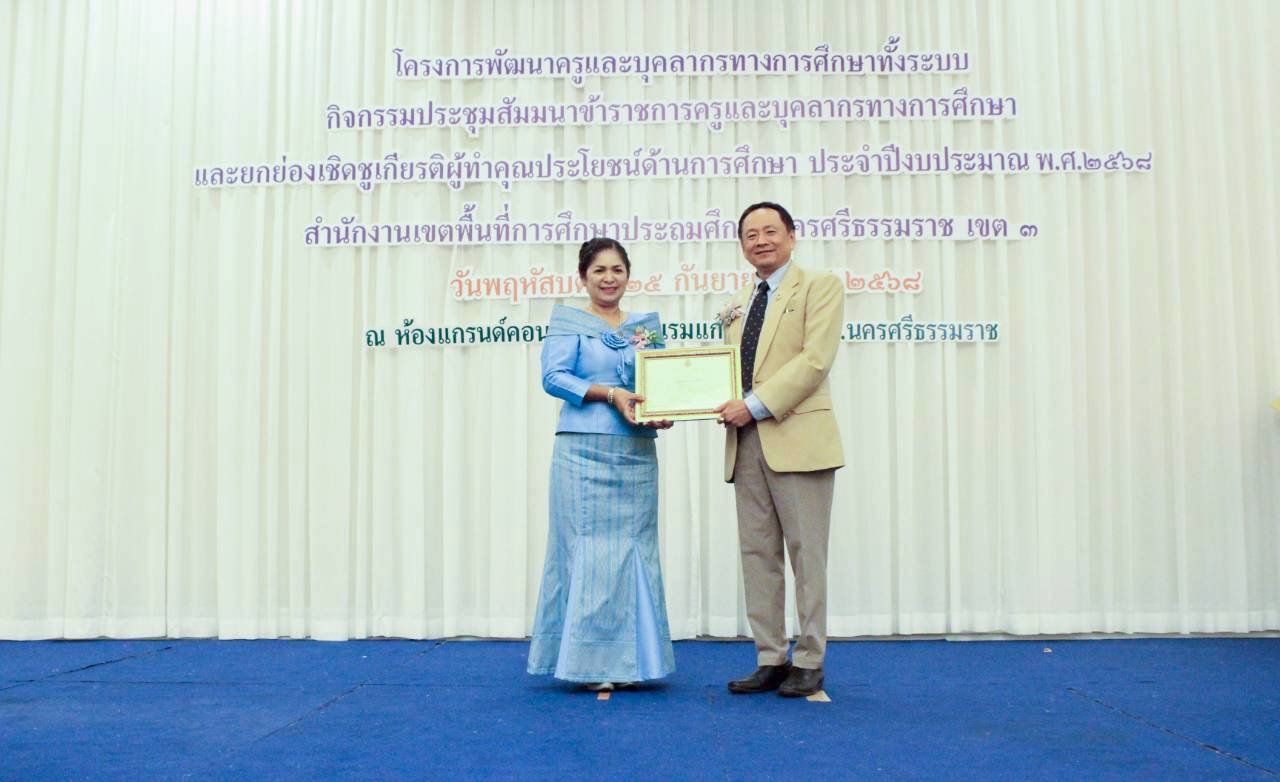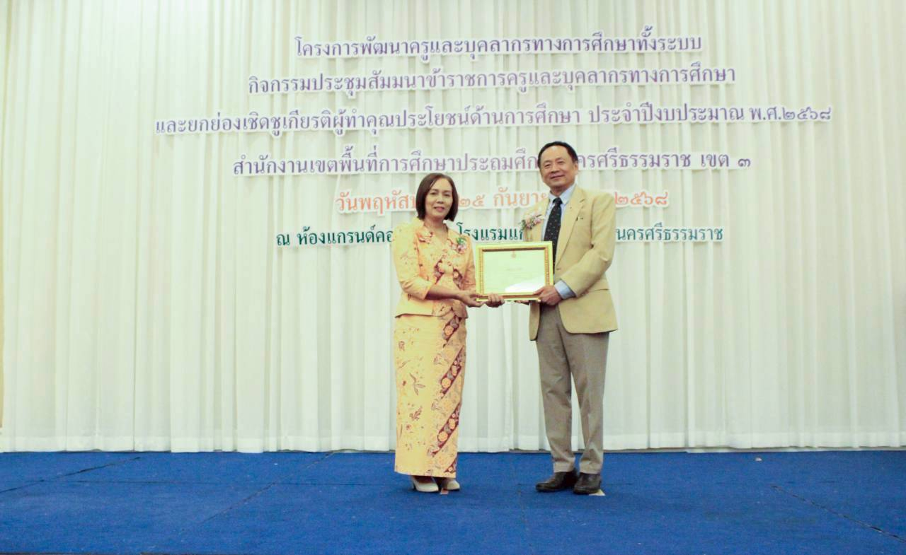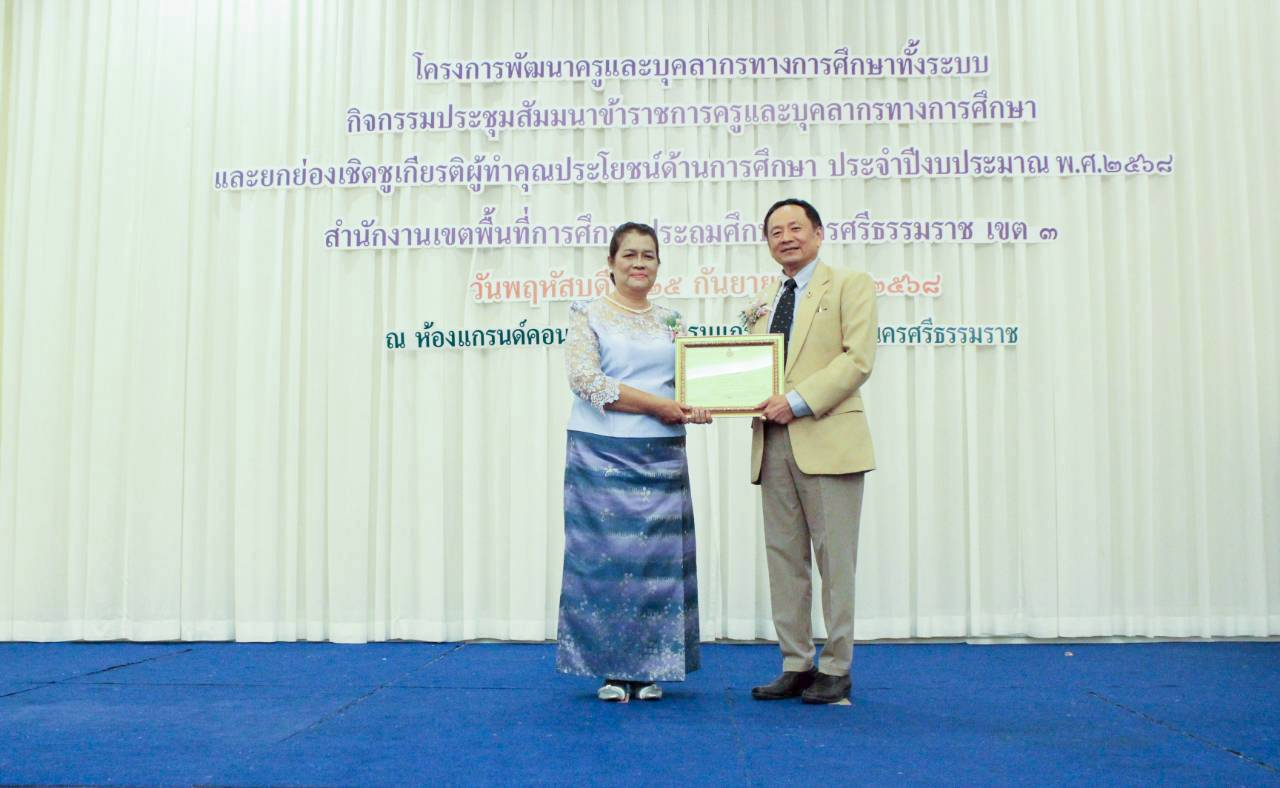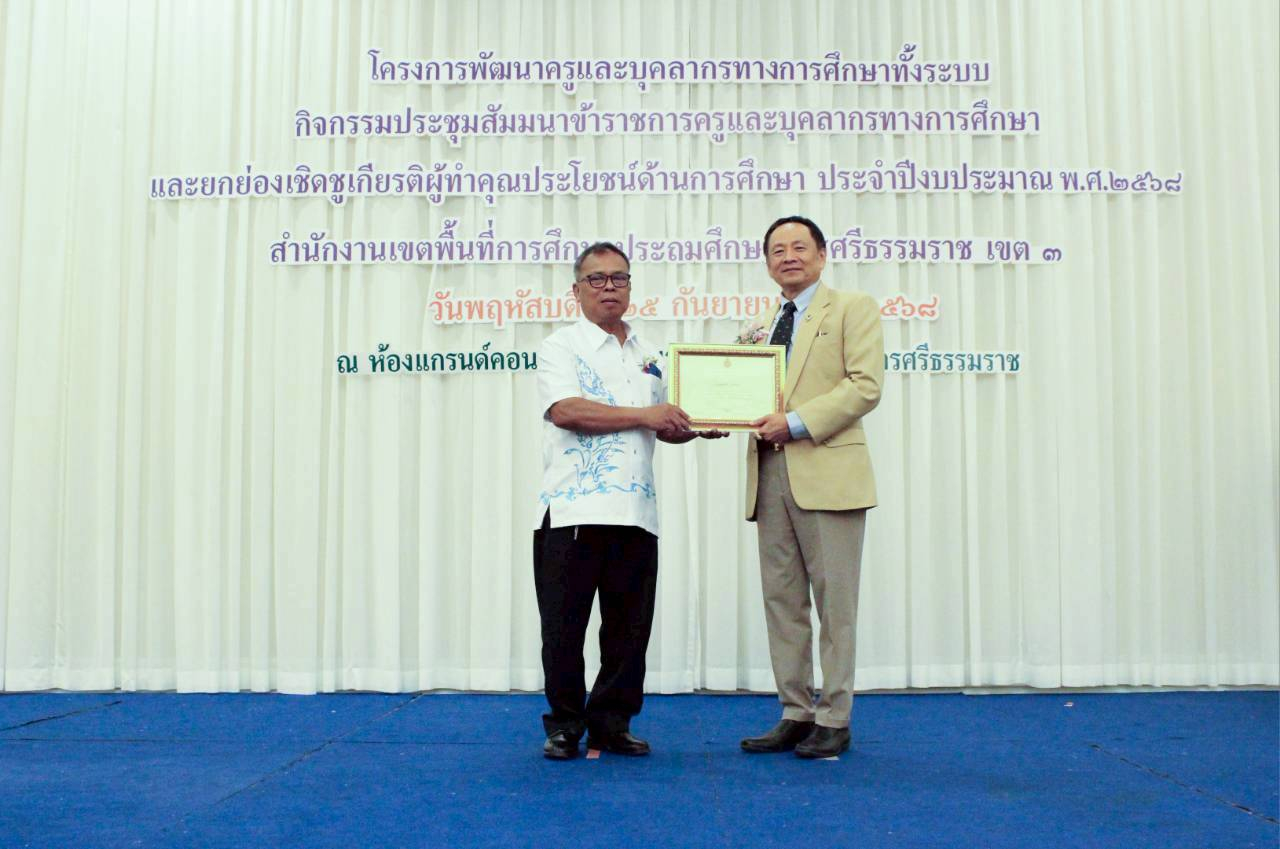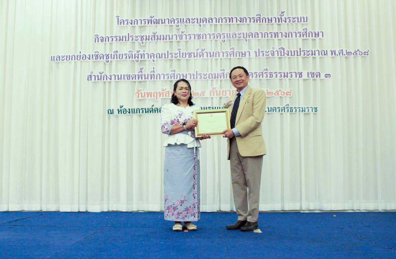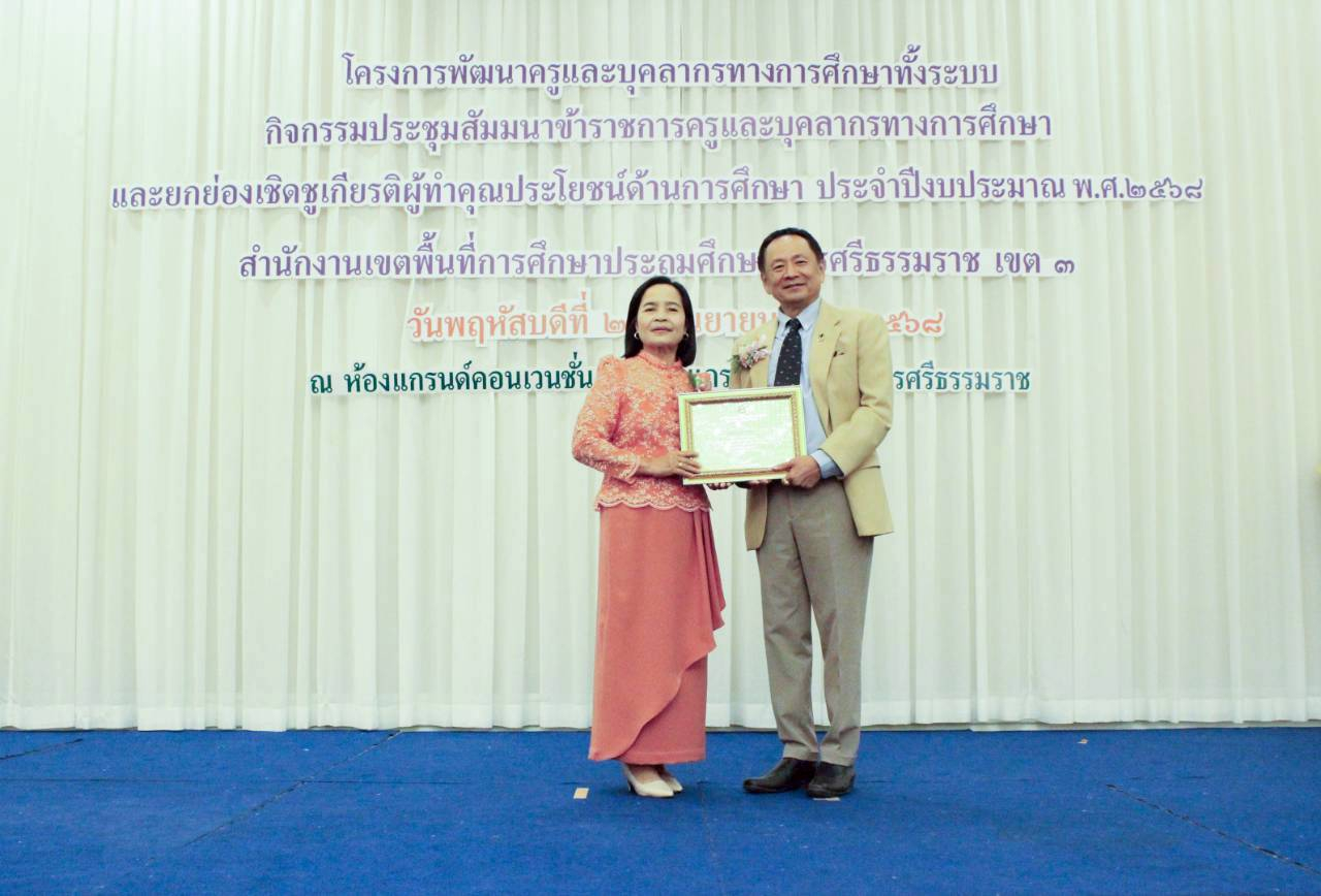 วันพฤหัสบดีที่ 25 กันยายน 2568 นายพิพัฒน์ แสนโสม ผู้อำนวยการสำนักงานเขตพื้นที่การศึกษาประถมศึกษานครศรีธรรมราช เขต 3 มอบหมายให้ นายโสภาส โอพริก รองผู้อำนวยการสำนักงานเขตพื้นที่การศึกษาประถมศึกษานครศรีธรรมราช เขต 3 ดำเนินการจัดโครงการพัฒนาครูและบุคลากรทางการศึกษาทั้งระบบกิจกรรมประชุมสัมนาข้าราชการครูและบุคลากรทางการศึกษาและยกย่องเชิดชูเกียรติผู้ทรงคุณวุฒิผู้ทำคุณประโยชน์ด้านการศึกษา ประจำปีงบประมาณ พ.ศ. 2568