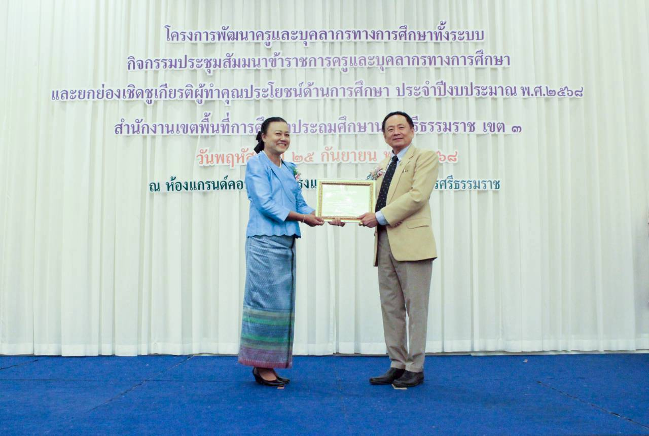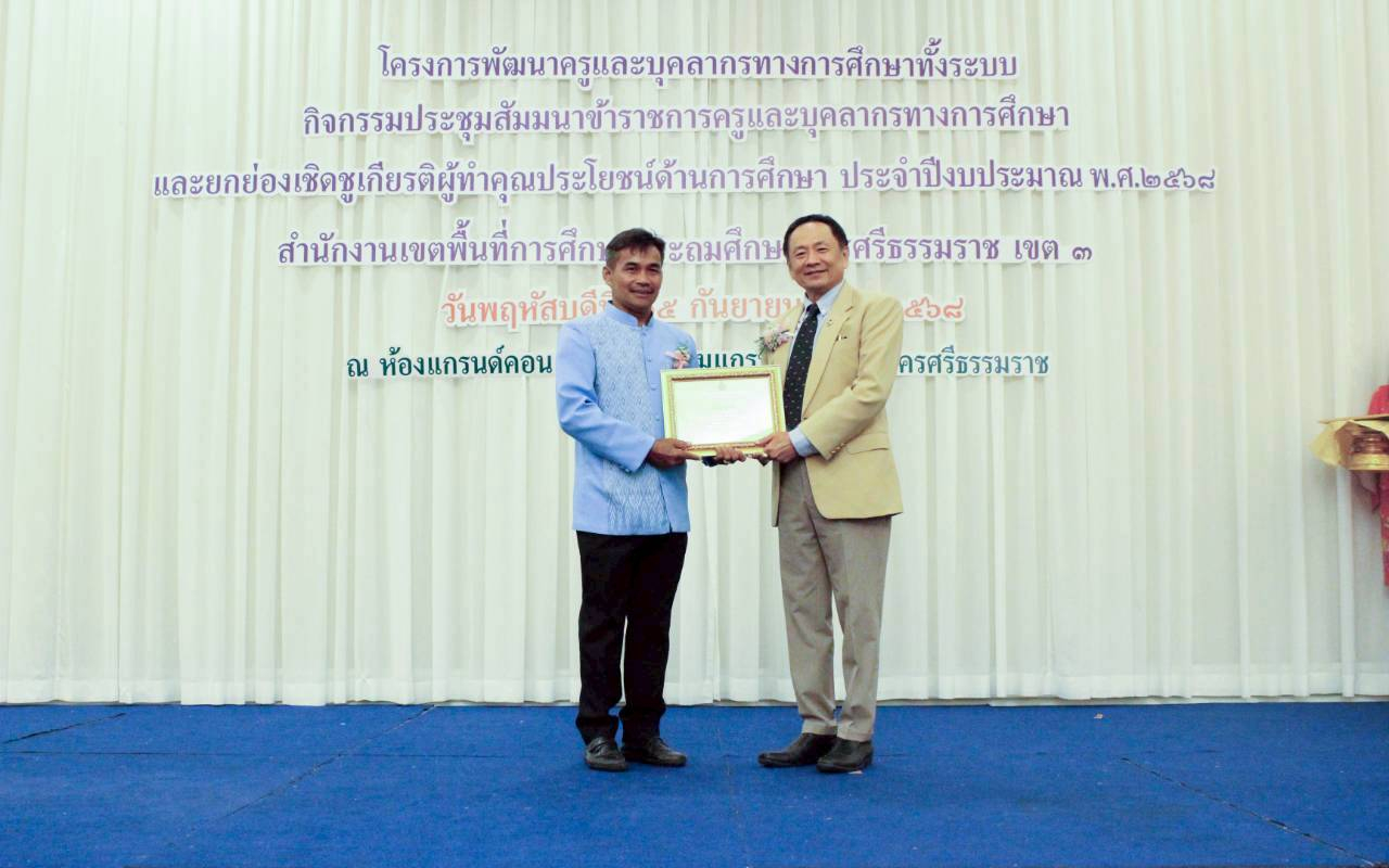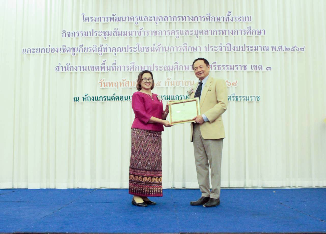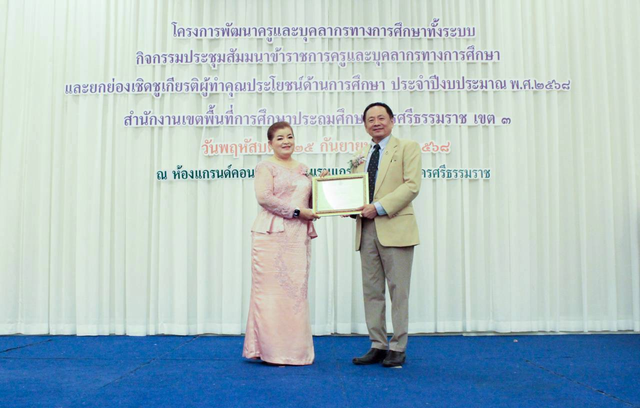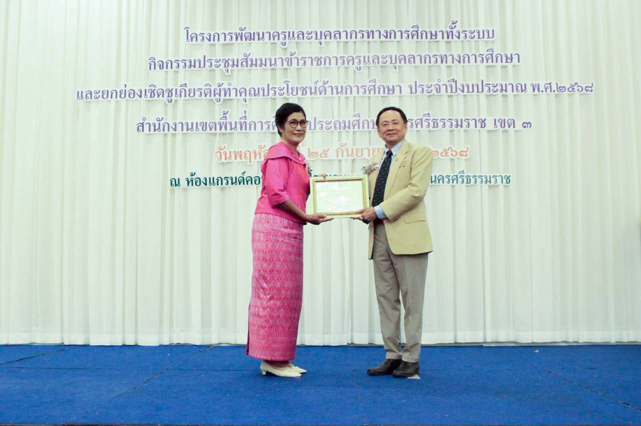 วันพฤหัสบดีที่ 25 กันยายน 2568 นายพิพัฒน์ แสนโสม ผู้อำนวยการสำนักงานเขตพื้นที่การศึกษาประถมศึกษานครศรีธรรมราช เขต 3 มอบหมายให้ นายโสภาส โอพริก รองผู้อำนวยการสำนักงานเขตพื้นที่การศึกษาประถมศึกษานครศรีธรรมราช เขต 3 ดำเนินการจัดโครงการพัฒนาครูและบุคลากรทางการศึกษาทั้งระบบกิจกรรมประชุมสัมนาข้าราชการครูและบุคลากรทางการศึกษาและยกย่องเชิดชูเกียรติผู้ทรงคุณวุฒิผู้ทำคุณประโยชน์ด้านการศึกษา ประจำปีงบประมาณ พ.ศ. 2568