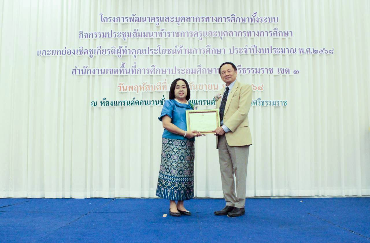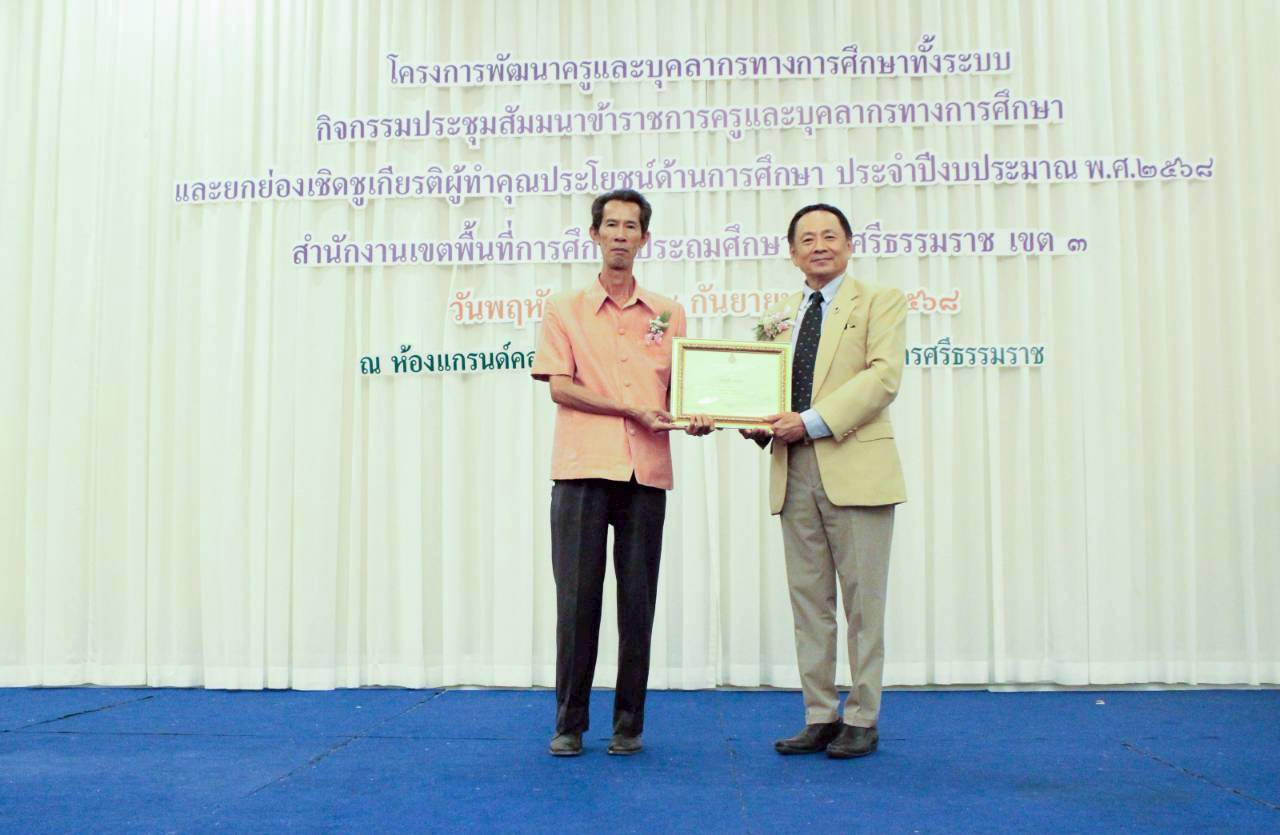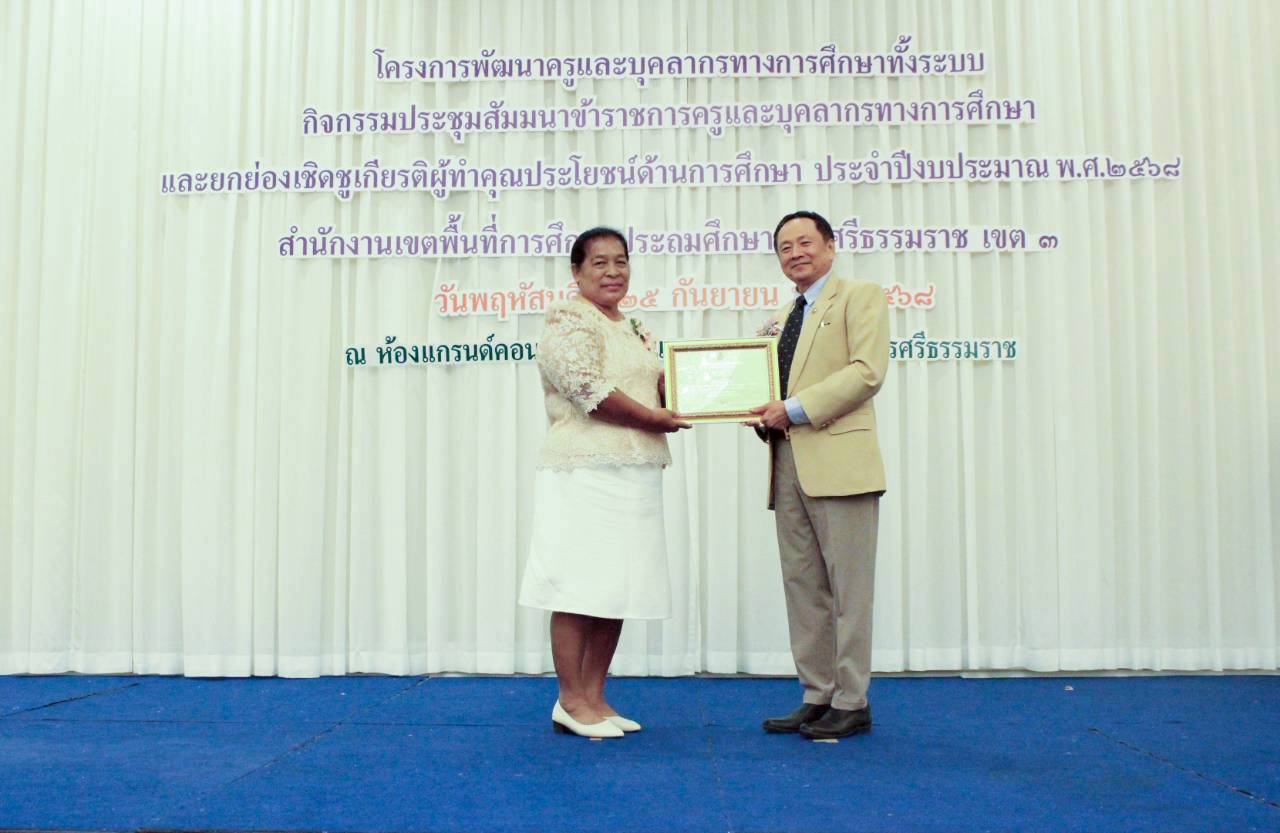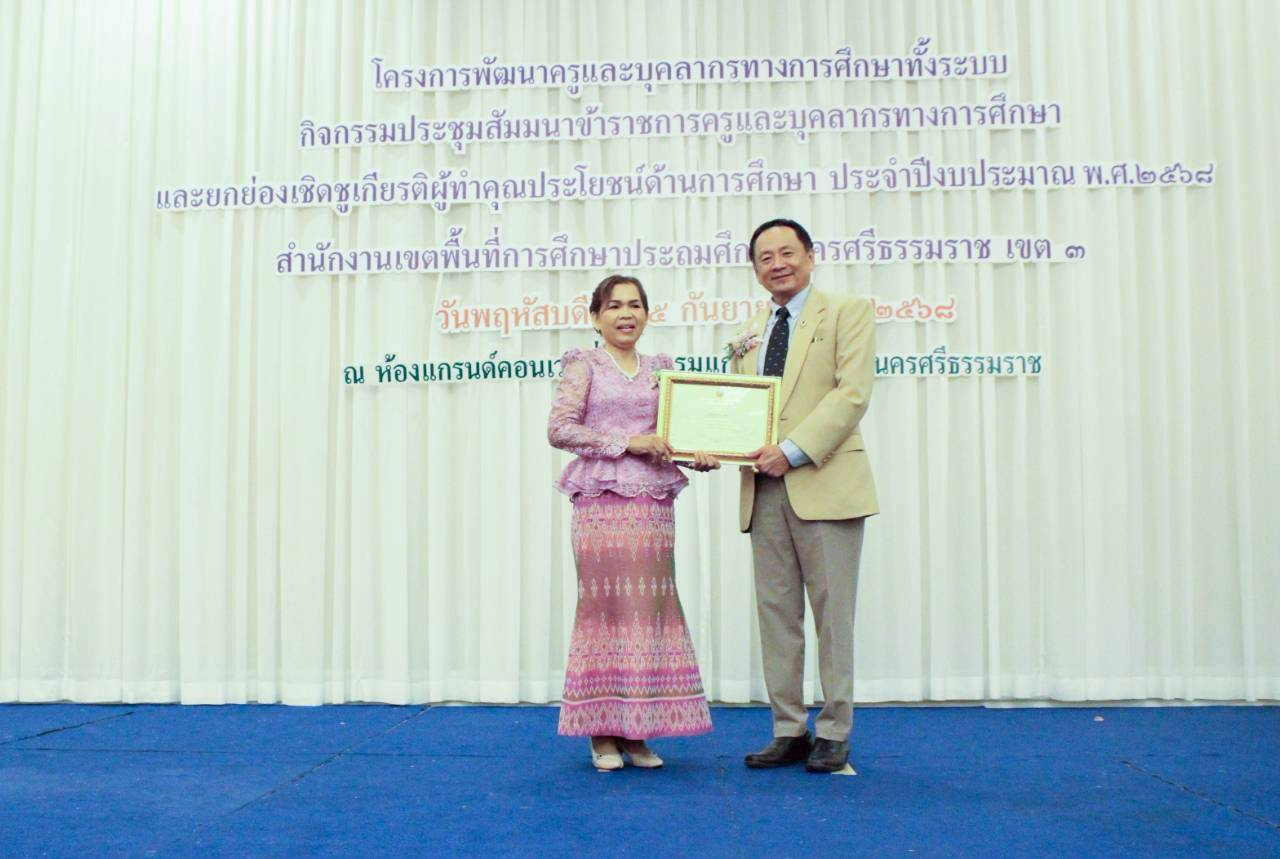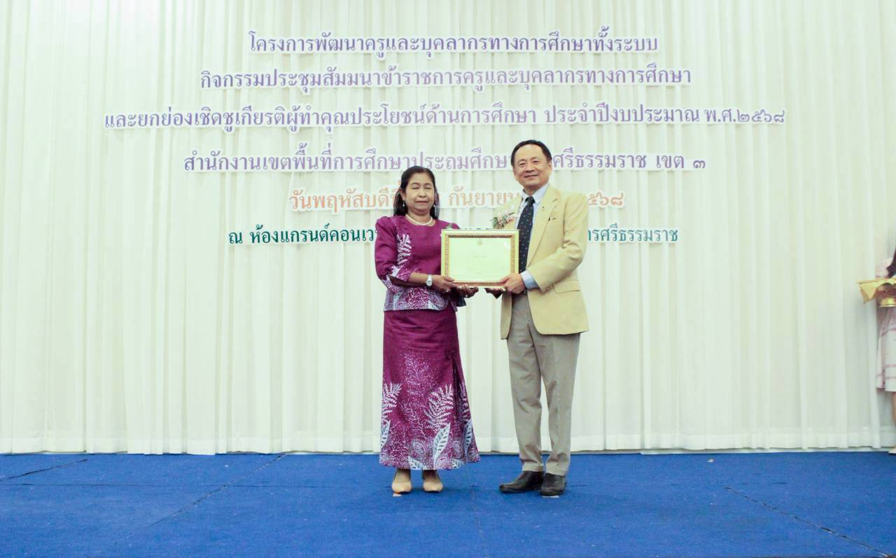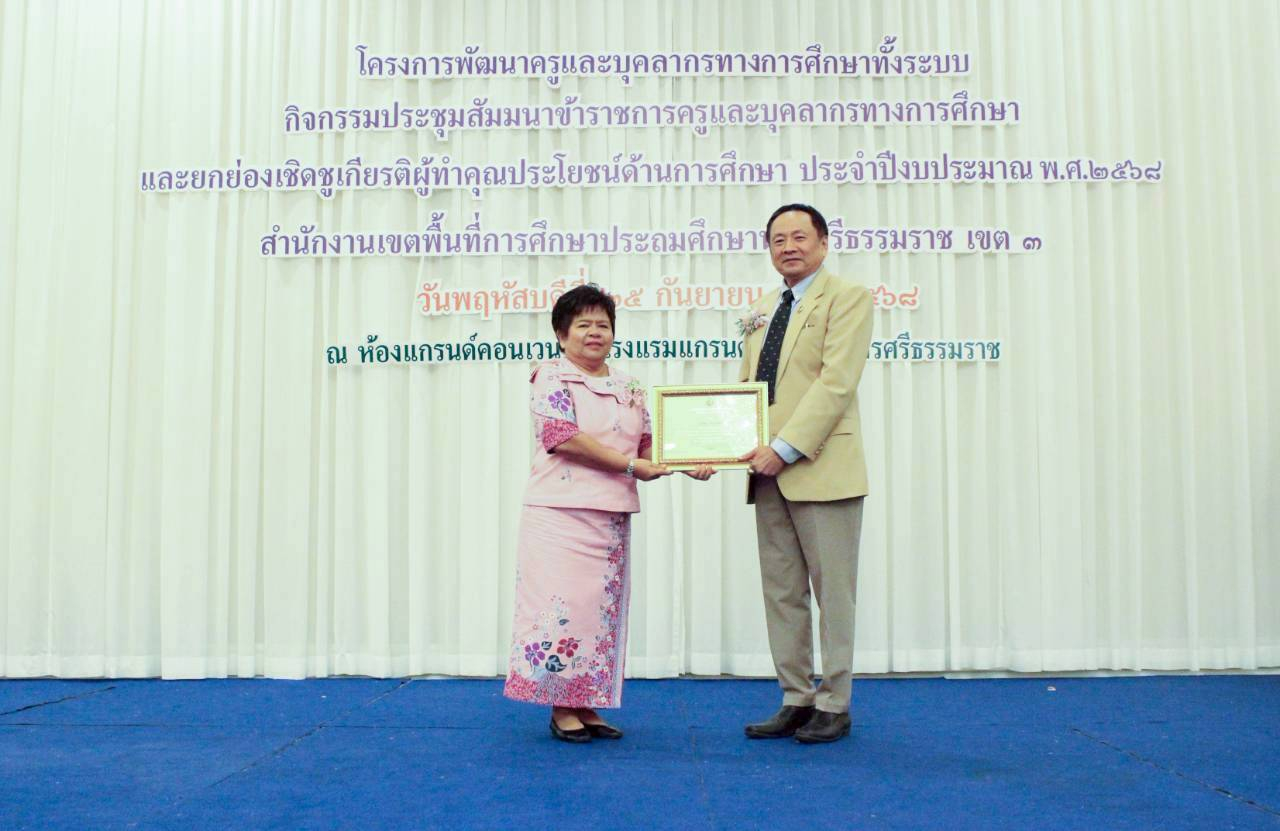วันพฤหัสบดีที่ 25 กันยายน 2568 นายพิพัฒน์ แสนโสม ผู้อำนวยการสำนักงานเขตพื้นที่การศึกษาประถมศึกษานครศรีธรรมราช เขต 3 มอบหมายให้ นายโสภาส โอพริก รองผู้อำนวยการสำนักงานเขตพื้นที่การศึกษาประถมศึกษานครศรีธรรมราช เขต 3 ดำเนินการจัดโครงการพัฒนาครูและบุคลากรทางการศึกษาทั้งระบบกิจกรรมประชุมสัมนาข้าราชการครูและบุคลากรทางการศึกษาและยกย่องเชิดชูเกียรติผู้ทรงคุณวุฒิผู้ทำคุณประโยชน์ด้านการศึกษา ประจำปีงบประมาณ พ.ศ. 2568
